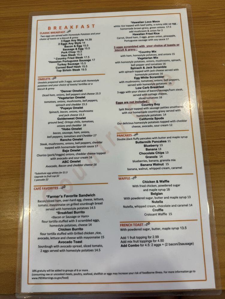 For those seeking a taste of the islands, the Hawaiian Portuguese Sausage comes highly recommended. You can also explore Cafe’s Favorites like the savory Loco Moco or the decadent Eggs Benedict. Customers rave about the fantastic service, highlighting the attentive staff and the warm ambiance, making each visit feel like a special occasion. Whether you’re after a delightful breakfast burrito or a comforting plate of California Spuds, it’s clear that Country Cafe Santa Ana offers a truly delicious experience.